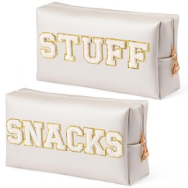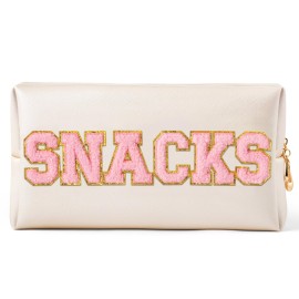 Y1tvei SNACKS STUFF Bag Pouch - Preppy White Snacks Stuff Chenille Varsity Letter Makeup Bag Leather Waterproof Toiletry Cosmetic Zipper Pouch for Purse Travel Organizer Gift for Women(Shell Gold)