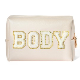 Y1tvei Preppy Patch White Body Chenille Letter Cosmetic Bag for Women(Shell Gold) Package: 1 Pc of shell gold cosmetic bag sewn with white BODY letter Material:PU leather. Size: Approx. 8*2.7*5.1 inches (L*W*H) Notice: 1.All products are manually measured. Please allows 0.1-0.2 inches error as manual measurement. 2.The color of the product may be s..