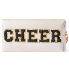 Y1tvei CHEER Large Cosmetic Bag - Preppy Patch CHEER Black Chenille Letter Makeup Bag PU Leather Waterproof Portable Cheer Letter Toiletry Pouch Travel Organizer for Cheerleader Girl (Shell Gold)