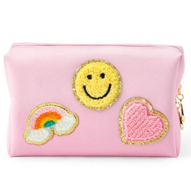 LieToi Preppy Patch Small Toiletry Bag, Smile Rainbow Heart PU Leather Portable Waterproof Makeup Cosmetic Bag Daily Use Storage Purse Travel Organizer Compliant Bag for Women Girls (Light Pink)