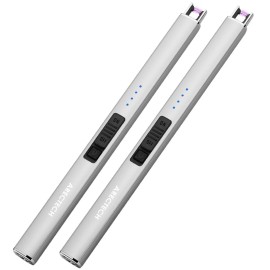 ARECTECH Electric Arc Candle Lighter Flameless Rechargeable USB Long Lighters for Candle Cooking BBQs Fireworks Silver 2 Pack