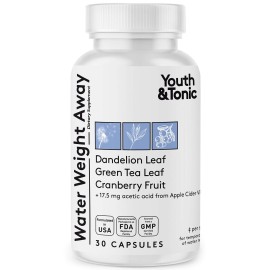 Youth & Tonic Natural Water Weight Away - Herbal Diuretic Pills for Bloating, Water Retention & Swelling Support for Women & Men - 60 Caps with Dandelion, Potassium, Green Tea & Apple Cider Vinegar
