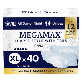 NorthShore MegaMax Briefs are tab-style adult diapers for men, women, and larger children. MegaMax disposable refastenable incontinence underwear provide reassuringly strong protection for even the heaviest bladder and/or bowel control leaks or floods.Super-premium adult diapers with a waterproof, thick plastic exterior resists sagging, odors, cond..