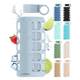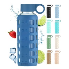 purifyou 40oz / 32oz / 22oz / 12oz Borosilicate Glass Water Bottle with Time & Volume Markers, Silicone Sleeve, Stainless Steel Lid | Reusable Glass Bottle for Water & Juice (32oz Aqua Blue)