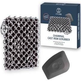 Zylark 316L Cast Iron Scrubber + Scraper Tool - Pan Cleaner Scrubber with Silicone Insert - Cast Iron Cleaning Kit - Chainmail Scrubber for Cookware