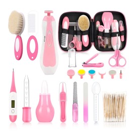 Infant Grooming Essentials: Electric Safety Nail Trimmer, Nasal Aspirator, Hair Brush, Comb, Nail Clipper (27 Piece Safety Care Set for Newborns - Pink)