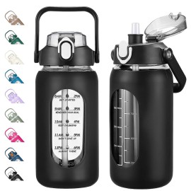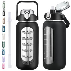 kytffu 64oz Glass Water Bottles with Straw, Half Gallon Motivational Glass Bottle with Silicone Sleeve and Time Marker, 2L Leakproof Large Glass Water Jug for Gym Home Office,Black