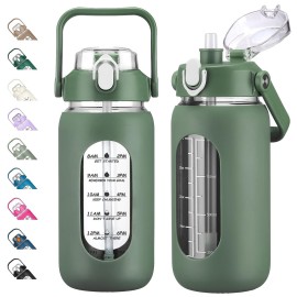 kytffu 64oz Glass Water Bottles with Straw, Half Gallon Motivational Glass Bottle with Silicone Sleeve and Time Marker, 2L Leakproof Large Glass Water Jug for Gym Home Office,olive