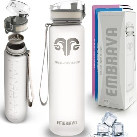 Embrava Best Sports Water Bottle - 32oz - Leakproof & BPA Free, Ideal for Gym, Hiking & Travel - Flip Top, Wide Mouth, Durable Tritan Plastic - Water Bottle with Strap & Filter - White