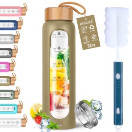 Aqulea Glass Water Bottles 32 Oz with Silicone Sleeve - BPA Free Reusable Wide Mouth Glass Motivational Water Bottles with Fruit Infuser - Leak Proof Borosilicate Water Bottle with Time Marker (Champ)