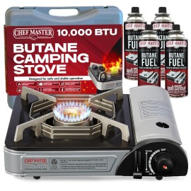 Chef Master 15,000 BTU Butane Portable Camp Stove + 4x 8oz Butane Canisters | Double Wind-Guard Portable Stove Burner w/Piezo Ignition for Emergencies, Tailgating, Hiking & Camping Essentials - 90019