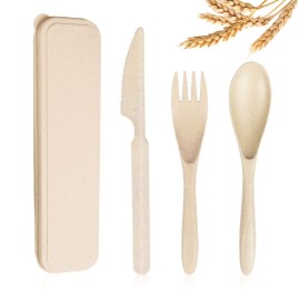 YOU WILL GET - 1 sets reusable utensils set with case in beige colors. The cutlery case includes one fork,one spoon and one knife. It is enough for daily use. ECO-FRIENDLY - Our travel utensils are made of natural wheat straw and food PP, lightweight but durable, chip resistance, reusable and dishwasher safe. Tip:Please keep the wheat straw tablewa..