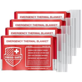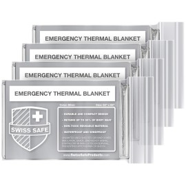 Swiss Safe 4 Pack Mylar Emergency Blankets for Survival - Compact & Insulated for Cold Weather - Designed for NASA, Outdoor, Running, Camping, Survival, First Aid Car Kit - Silver, 4 Pack