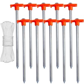 ABCCANOPY 10 Inch Tent Stakes 10 Pcs Non-Rust Metal Ground Anchors, Heavy Duty Spikes with 4 Ropes for Outdoor Camping, Reddish Orange