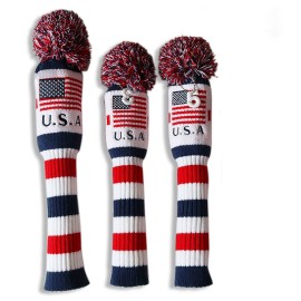 Craftsman Golf US Flag Knit Pom Pom White Blue Red Driver,Fairway Wood, Hybrid Head Cover Headcover for Callaway Mizuno Cobra Taylormade (3pcs (1,3,5))