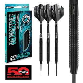 Set of 3 x 28g - 85% premium quality Red Dragon tungsten darts; Red Dragon Nitrotech stems; Red Dragon Hardcore flights; Stunning Black PVD coating with aggressive Razoredge grip technology; Razor Edge Black are available in 22g, 24g, 26g & 28g weights..