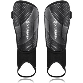 Shin Guards Soccer Kids Youth, CE Certified AirsFish Shin Guard Protection Gear for 2-18 Years Old Boys Girls Teenagers High Impact Resistant Breathable Comfortable (S Plus, Dark Black)