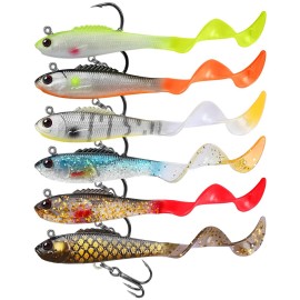 GOTOUR Pre-Rigged Soft Fishing Lures, Curly Tail Swimbait for Bass, Pike, Trout, Walleye, Salmon, Redfish, Crappie, All Season Freshwater Fishing Bait