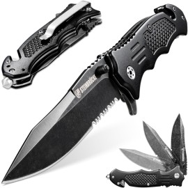 Specifications: Color: Black Blade Material: 8Cr13Mov Stainless Steel Size: 20.5 x 4 cm Handle Material: Aluminum (black matte) Includes built in glass breaker and belt cutter hunting knife Built in 1.5mm masking sheet The stainless steel gear is of high quality and high hardness To open the knife press lightly on the outer frame lock and the blade..