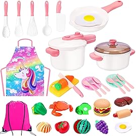 Meaicezli Kids Play Kitchen Accessories Set, Pretend Kids Pots and Pans Playset Toddler Cooking Set Play Kitchen Toys with Fake Play Food Dishes Utensils for Girls Boys Ages 1 2 3 4 5 6 7 8, Pink