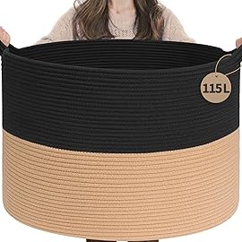 INDRESSME 115L Extra Large Cotton Rope Blanket Basket for Nursery, Boho Decor Baby Laundry Baskets for Kids Toy Organizer Storage Bin for Dirty Clothes Pillows Towel, Black & Camel