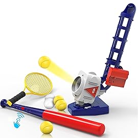- 2 in 1 Pitching Machine: This 2 in 1 baseball and tennis pitching machine set includes a pitching machine, a baseball bat, a tennis racket, and 6 balls. Children can enjoy playing both baseball and tennis using the same machine. | 2 Different Modes: The machine offers two play modes. In auto mode, balls are pitched every 5-7 seconds. In RC mode, kids can control the pitching by pressing a button on the bat. Please note that the tennis racket is only compatible with auto mode. The machine requires 4 D batteries and 5 AAA batteries (batteries not included). | Easy Assembly: Simply connect Ball Channel A to Ball Channel B, insert the Main Unit into the Base section, and the product is assembled. Ensure that the product is equipped with new batteries for optimal performance. | Outdoor Backyard Sports: Encourage children to engage in outdoor sports activities, keeping them away from electronic devices. This machine allows kids to exercise, have fun, and appreciate nature. | Great Gift Choice: A big hit for party games, outdoor activities, yard games, and holiday celebrations like birthdays, festivals, Christmas, Halloween, Thanksgiving, and New Year's. Give your child a gift that fosters endless joyful moments and active play.