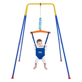 - BABIES LOVE TO JUMP: Keeps your baby active and engaged with spring-loaded movement-perfect for releasing energy before naps or bedtime while supporting coordination and safe indoor play | TRUSTED FOR OVER 75 YEARS: Loved by generations, this iconic Jolly Jumper delivers a safe, reliable jumping experience and long-lasting quality that still brings joy to babies today | GROWS WITH YOUR BABY: Saddle seat keeps baby upright and supported while adjustable height ensures a secure fit from approx. 3 months to walking age, up to 28 lbs | SETUP TAKES SECONDS: No tools required-just clamp to most door frames with trim. Lightweight steel frame makes this jumper easy to install, move, and use for daily jumping sessions | PORTABLE AND SPACE-SAVING: Compact design moves easily between rooms. Ideal for travel, apartments, or small spaces-this doorway jumper stores easily and fits busy family routines