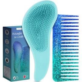 Lily England Detangler Brush & Comb Set - Lightweight Wide Tooth Detangling Tool for Women & Kids - Smooths Curly, Straight, Dry, Fine, & Thick Hair, Blue Glitter