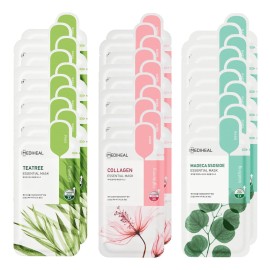 Mediheal Sheet Mask Essential HERO 30 Pack (Collagen, Tea Tree, Madecassoside) | Korean Skincare Facial Sheet Mask Combo, Moisturizing, Soothing and for Blemishes