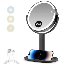 MIYADIVA Makeup Mirror with Lights,20X Magnifying Mirror with Light and Touch Switch,Vanity Mirror with 3 Color Light and 80 LEDs,2-Sided Lighted Magnified Mirrors 8.8 Inches, Black