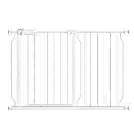 - UNIVERSALLY FITS - Expands to fit openings between 26-40" wide. Whether it is a narrow bathroom door, toilet door, wide doorway, or stair, it is suitable. Standing an impressive 30" tall, which is ideal for use with toddlers and small pets. Please measure your opening prior to purchase to ensure proper fit. | EASY TO INSTALL - Pressure mount design that is quick to set up. No additional tools are required for installation, and no need to punch holes in the wall. NOTE: Before installation, there will be a gap between the gate latch and the frame which is NOT a defect, and it is NOT bent. This gap will be eliminated once installed. | AUTO-CLOSE FEATURE - For added hands-free convenience, it is equipped with an auto-close feature that gently closes the door and a stay-open feature that keeps it open. It can be opened easily with a one-hand operation. | SAFE DOUBLE LOCK LEVER - Features a walk-through door designed with a double lock lever handle, allowing adults to easily pass through. It is ideal as a play yard, fireplace barrier, at the landing of stairs, or a super gate for wide openings. | WHAT YOU GET- Includes a 5.5" wide extension kit, 2 2.7" wide extension kits, 2 Y-bolts and 4 wall protectors. Perfect for doorway, hallway, and bottom of stair with banister. Can be removed quickly out of the opening for easy storage and reuse.