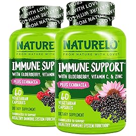 Premium Quality NATURELO Immune Support w/ Elderberry, Vitamin C, Zinc and Echinacea supplement supports healthy immune system response.* Includes premium ingredients: 350 mg Black Elderberry, 250 mg Vitamin C (from L-Ascorbate & Acerola Cherry Extract), 100 mg Echinacea and 15 mg Zinc (from Zinc Citrate). Made in a GMP Compliant Facility, Non-GMO,..