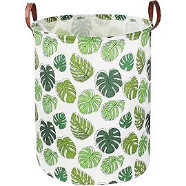 NTAOHAMPER Round Green Laundry Hamper, Jungle Themed Nursery Decor, Tropical Pattern Basket, Monstera Room Decor,Waterproof Storage Bin, Gift Basket(Leaf)