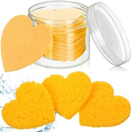 Nuenen 60 Pieces Facial Sponges with Container, Heart Shape Compressed Face Sponges Natural Cleaning Pads for Washing Face Cleaning Exfoliating Esthetician Makeup Removal(Yellow)