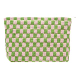 PAZIMIIK Knitted Checkered Makeup Bag Large Zipper Make Up Accessory Pouch for Purse Cosmetic Brush Bag for Travel Essential Pink Green