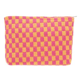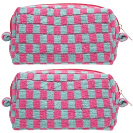 PAZIMIIK Knitted Checkered Makeup Bag Large Zipper Make Up Accessory Pouch for Purse Cosmetic Brush Bag for Travel Essential Magenta Green