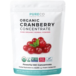 USDA Organic Cranberry Concentrate (50:1) Powder - 500mg is Equivalent to 25,000mg of Fresh Cranberries - For Kidney Cleanse & UTI Support Vitamins - Women - Supplement - 100 Servings - No Pills