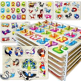 QUOKKA Wooden Puzzles for Toddlers 1-3 - 6XSET Toddler Puzzles Ages 2-4 with Rack - Learning Alphabet - Numbers - Animals Montessori Toy for Kids 3-5 - Wood Games Gift for Boys and Girls