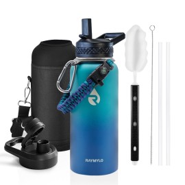 RAYMYLO Insulated Water Bottle 32 oz, Triple Wall Vacuum Stainless Steel (Cold for 48 Hrs), Leak Proof & Non-BPA, Modern Water Flask Jug with Paracord Handle & Straw Spout Lids, Cyan Blue