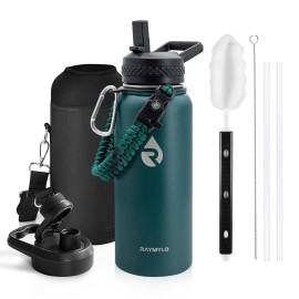 RAYMYLO Insulated Water Bottle 32 oz, Triple Wall Vacuum Stainless Steel (Cold for 48 Hrs), Leak Proof & Non-BPA, Modern Water Flask Jug with Paracord Handle & Straw Spout Lids, Dark Green