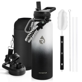 RAYMYLO Insulated Water Bottle 40 oz, Triple Wall Vacuum Stainless Steel (Cold for 48 Hrs), Leak Proof & Non-BPA, Modern Water Flask Jug with Paracord Handle & Straw Spout Lids, Ombre: White/Black