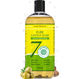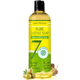 Seven Minerals, EWG Verified Castile Soap 33.8 fl oz - No Palm Oil, GMO-Free - Unscented Mild & Gentle Liquid Soap For Sensitive Skin & Baby Wash - All Natural Vegan Formula with Organic Carrier Oils