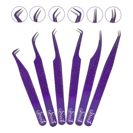 SIVOTE Eyelash Extension Tweezers Fiber Tips, Set of 6, Curved, Dolphin, 90 Degree 45 Degree, Volume Boot & Slight Curved Tweezer, Purple