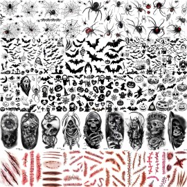 TASROI 236+ PCS 45 Sheets Halloween Temporary Tattoos For Kids Zombie Makeup Kits 3D Bats Spider Web Witch Small Black Ghost Pumpkin Face Stitches Fake Scar Tattoo Stickers For Women Adult Men Skull