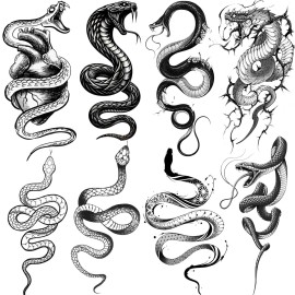 8 Sheets Cobra Snake Temporary Tattoos For Women Men Adults, Half Arm Sleeve Fake Tattoo Stickers Serpent, 3D Waterproof Halloween Black Realistic Snake Tattoos For Legs Forearm Back Neck Sets