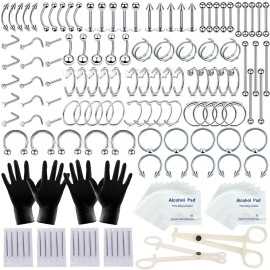 Get everything you need for piercing with this professional 140-piece kit. It includes 105 pieces of piercing jewelry for nose, septum, ear, eyebrow, tragus, cartilage, lip, tongue, and belly button piercings. You\'ll also get 10 14G piercing needles, 10 16G piercing needles, 2 gloves, 10 cleaning pads, and 2 disposable piercing clamps to ensure a ..
