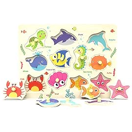 Wooden Peg Puzzle, Sea Creature Chunky Baby Puzzles, Colorful Wood Shape Puzzle Peg Board, Animal Knob Puzzles for Educational Toddlers 18 Months and Up, 11 Pieces