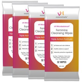 vH essentials Feminine Cleansing Wipes, 32 ct. 4 pk - pH Balanced, Prebiotics, Tea Tree & Aloe, Soothing Witch Hazel, Odor-Blocking Formula, Vaginal and Perianal Care, Alcohol, and Fragrance-Free