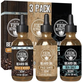 Viking Revolution Beard Oil for Men 3 Pack - Natural Mens Beard Oil Variety Set - Coffee & Whiskey, Palo Santo, Sea Salt Scents - Beard Conditioning and Moisturizing for a Healthy Beard (3 Pack, 1oz)
