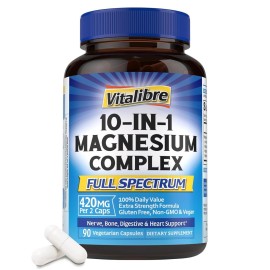 Vitalibre 10-in-1 Magnesium Complex offers a full spectrum magnesium profile of ten important types - glycinate, citrate, taurate, gluconate, malate, oxide, lactate, aspartate, succinate, and orotate formulated to give you all of the benefits of magnesium in one supplement. It provides comprehensive health support for nerve, bone, digestive, heart ..